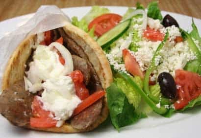 - Au moment de servir, mettre les pains pitas chauds dans quatre assiettes. Déposer deux brochettes d'agneau grillées sur chaque pain pita. Garnir de la sauce tzatziki.