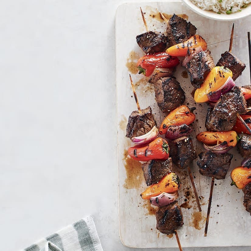 - Faire griller les brochettes à chaleur directe environ 3 minutes par côté, pour un total de 12 minutes. Badigeonner les brochettes avec le reste de la marinade à la mi-cuisson. Laisser reposer les brochettes dans une assiette recouverte de papier d'aluminium pendant 5 minutes. Servir avec du riz.