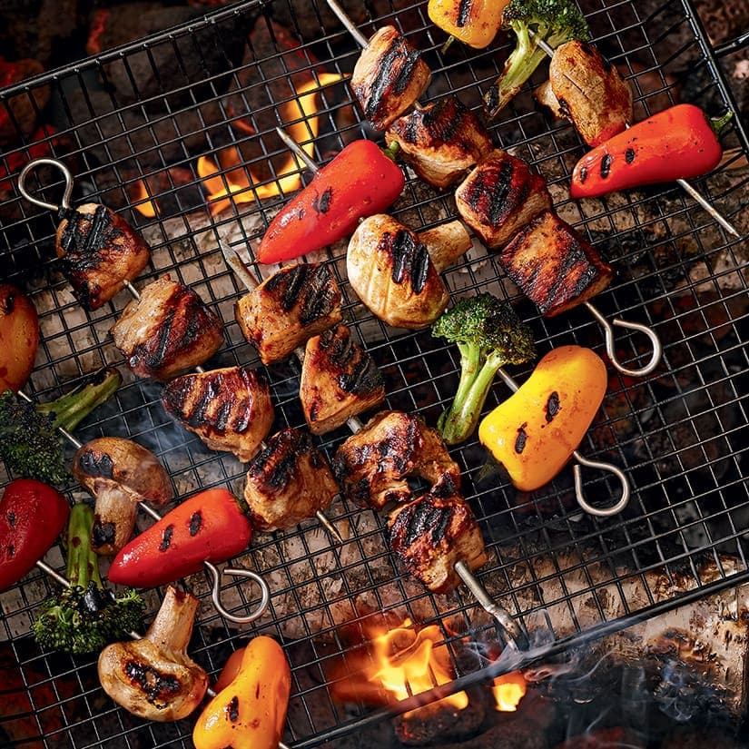 - Régler le barbecue à puissance moyenne. Retirer le poulet de la marinade (la jeter). Sur des brochettes en métal, enfiler les cubes de poulet en les espaçant de 1/4 po (5 mm). Sur d'autres brochettes, enfiler les légumes en les espaçant de 1/4 po (5 mm), puis les badigeonner de la marinade réservée.