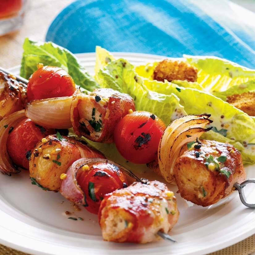 - Entourer chaque cube de poulet d'un morceau de bacon. Sur 12 brochettes en métal ou en bois préalablement trempées dans l'eau, enfiler les cubes de poulet en alternant avec les morceaux d'oignon rouge et les tomates cerises. Saler et poivrer. Régler le barbecue au gaz à puissance moyenne. Mettre les brochettes sur la grille huilée du barbecue, fermer le couvercle et cuire pendant environ 12 minutes ou jusqu'à ce que le bacon soit croustillant et que le poulet ait perdu sa teinte rosée à l'intérieur (retourner les brochettes trois fois en cours de cuisson).