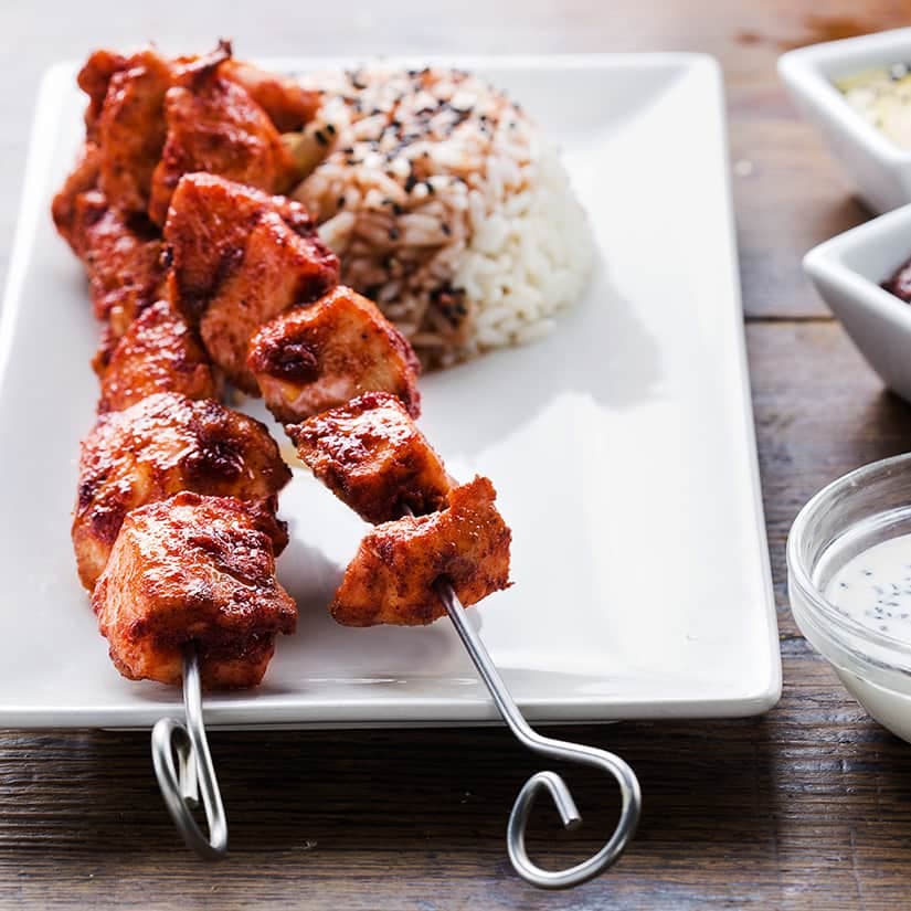 - Sur de petites brochettes de métal ou de bois préalablement trempées dans l'eau, enfiler les cubes de poulet (mettre deux cubes par brochette). Régler le barbecue au gaz à puissance moyenne-élevée. Mettre les brochettes sur la grille huilée du barbecue. Fermer le couvercle et cuire pendant environ 8 minutes ou jusqu'à ce que le poulet ait perdu sa teinte rosée à l'intérieur (retourner les brochettes une fois).