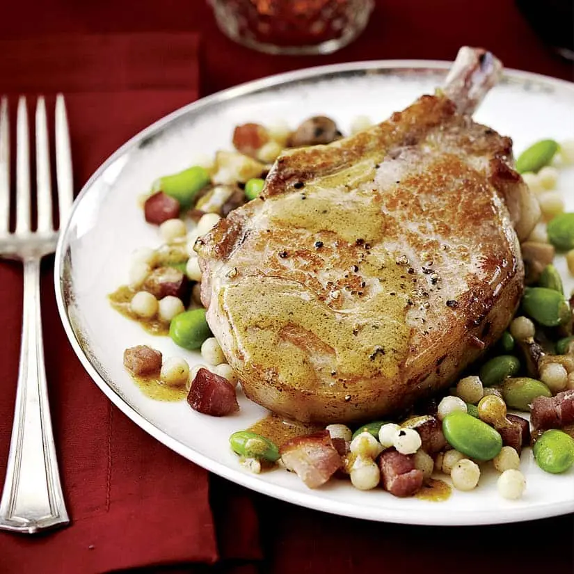 - Saler et poivrer les côtelettes de porc. Dans le poêlon, faire fondre le beurre à feu moyen. Ajouter les côtelettes et cuire pendant 4 minutes de chaque côté ou jusqu'à ce que le porc soit encore légèrement rosé à l'intérieur. Mettre la préparation de couscous réservée dans un plat de service et garnir des côtelettes de porc. Couvrir le plat de papier d'aluminium et réserver au chaud.