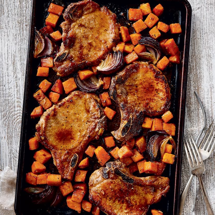 - Dans le poêlon, ajouter les patates douces et l'oignon. Réduire à feu moyen et cuire, en brassant de temps à autre, 6 minutes ou jusqu'à ce que les légumes soient légèrement dorés. Mettre les légumes sur la plaque, avec le porc. Verser la glace à l'érable réservée et retourner les côtelettes pour bien les enrober.