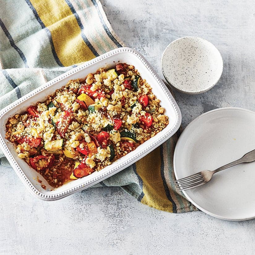 - Dans un bol, mélanger le parmesan, la chapelure, la farine et le beurre. Dans un grand plat à gratin d'une capacité de 12 t (3 L), mettre le mélange aux courgettes. Parsemer de la garniture au parmesan.