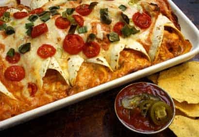 - Couvrir les enchiladas du reste de la sauce. Couvrir le plat de papier d'aluminium et cuire au four préchauffé à 375°F (190°C) pendant 30 minutes. Parsemer du reste du fromage et poursuivre la cuisson à découvert pendant 10 minutes ou jusqu'à ce que le centre des enchiladas soit chaud. Parsemer du reste de la coriandre.