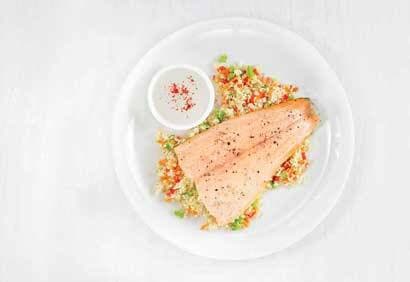 - Entre-temps, dans un bol, à l'aide d'un fouet, mélanger le yogourt, le tahini, la mayonnaise, le jus de citron, l'ail et le piment de Cayenne. Saler et servir avec la truite.
