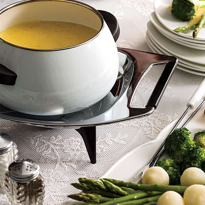 La fondue doit être servie chaude et bouillonnante, il est donc important de la mettre dans un plat à fondue. On l’accompagnera d’asperges et de bouquets de brocoli blanchis, de pommes de terre bouillies et de tranches de pomme.