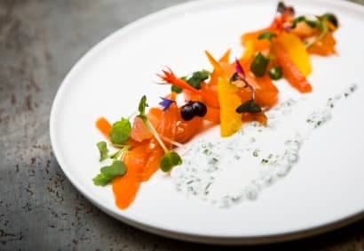 - Verser la sauce au fond des assiettes. Mélanger les tranches de gravlax avec l'huile d'olive et déposer au fond de l'assiette. Décorer des micropousses et des suprêmes d'agrumes réservés.