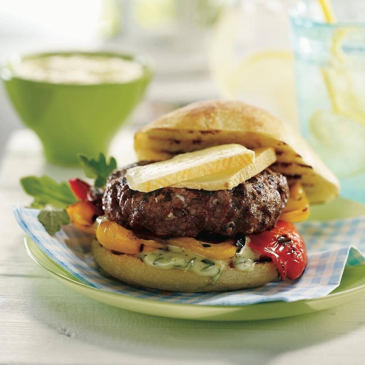 Hamburgers au fromage et aux poivrons grillés, mayo maison au thym