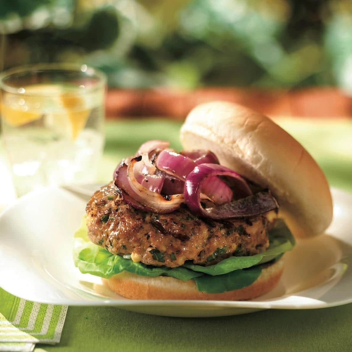 - Si désiré, mettre les pains sur la grille du barbecue et cuire pendant 2 minutes ou jusqu'à ce qu'ils soient dorés. Mettre les feuilles de laitue et les pâtés de porc sur la partie inférieure des pains et garnir de l'oignon grillé. Couvrir de la partie supérieure des pains.