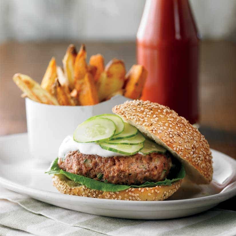- Dans un grand bol, à l'aide d'un fouet, battre l'oeuf. Ajouter le concombre haché, le germe de blé, 2 c. à tab (30 ml) de la sauce au yogourt (voir recette) la marjolaine, le poivre et l'agneau haché et bien mélanger. Façonner la préparation en quatre pâtés d'environ 3/4 po (2 cm) d'épaisseur.