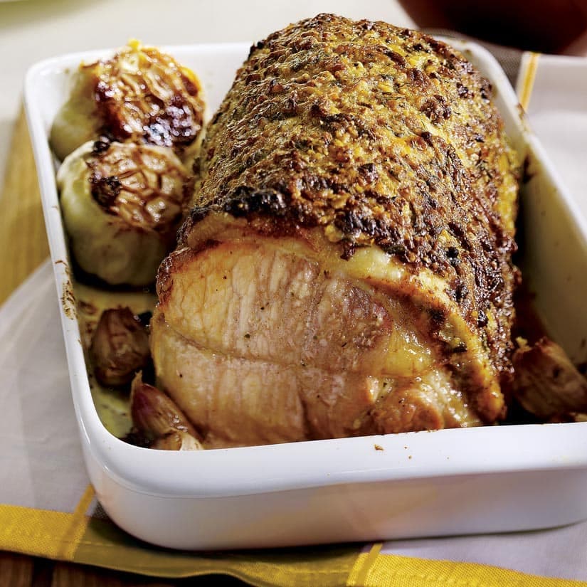 - Dans un petit bol, mélanger l'ail haché, 2 c. à thé (10 ml) du thym, le romarin, les graines de coriandre, la moitié du sel, du poivre et de l'huile et la moutarde. Badigeonner uniformément le rôti de porc du mélange à la moutarde. Mettre le rôti dans une rôtissoire ou un plat allant au four. Réserver.