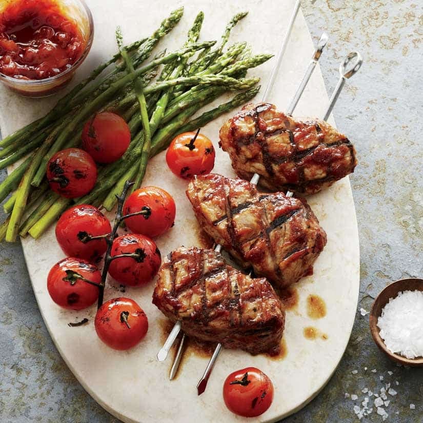 - Régler le barbecue au gaz à puissance moyenne. Retirer les médaillons de porc du sac en laissant couler l'excédent de sauce. Verser la sauce dans un petit bol. Enfiler les médaillons de porc, deux ou trois à la fois, sur deux ou trois brochettes en parallèle (selon la grosseur des médaillons). Mettre les brochettes sur la grille huilée du barbecue, fermer le couvercle et cuire de 7 à 9 minutes ou jusqu'à ce que les médaillons de porc soient dorés à l'extérieur et encore légèrement rosés à l'intérieur (retourner les médaillons à la mi-cuisson et les badigeonner de la sauce).