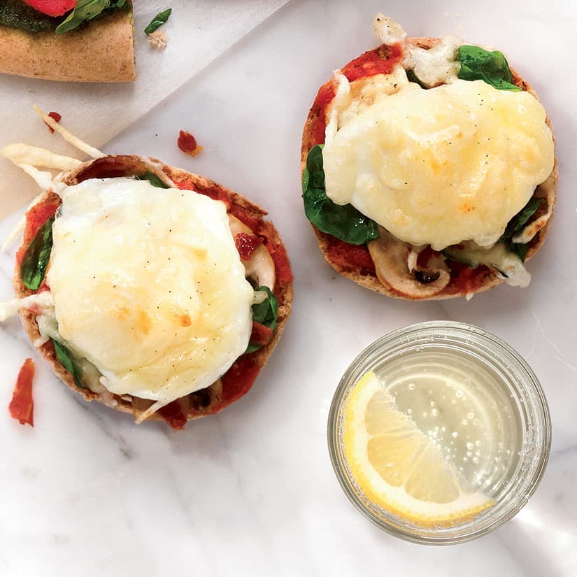 - 1. Répartir la sauce tomate, les épinards, les champignons et le prosciutto sur le pain.