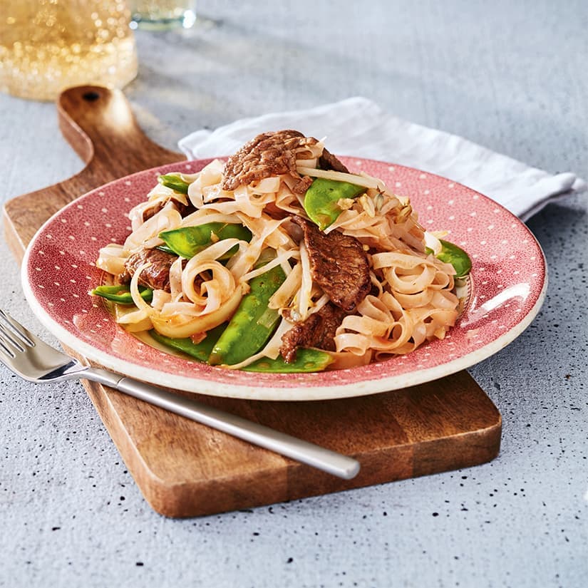 - Saler le bifteck. Dans un wok ou un grand poêlon, chauffer l'huile à feu vif. Ajouter le bifteck et cuire, en brassant sans arrêt, pendant 3 minutes ou jusqu'à ce qu'il soit doré. À l'aide d'une écumoire, retirer le bifteck du wok et réserver dans un bol. Dans le wok, cuire l'oignon à feu moyen-vif, en brassant, pendant 2 minutes ou jusqu'à ce qu'il soit doré. Ajouter l'ail et cuire, en brassant, pendant 1 minute. Ajouter les pois mangetout et les nouilles et la sauce réservées. Au besoin, ajouter un peu d'eau. Cuire, en brassant, pendant 3 minutes ou jusqu'à ce que les nouilles soient chaudes. Ajouter le bifteck réservé et les fèves germées, et réchauffer, en brassant, pendant 1 minute.