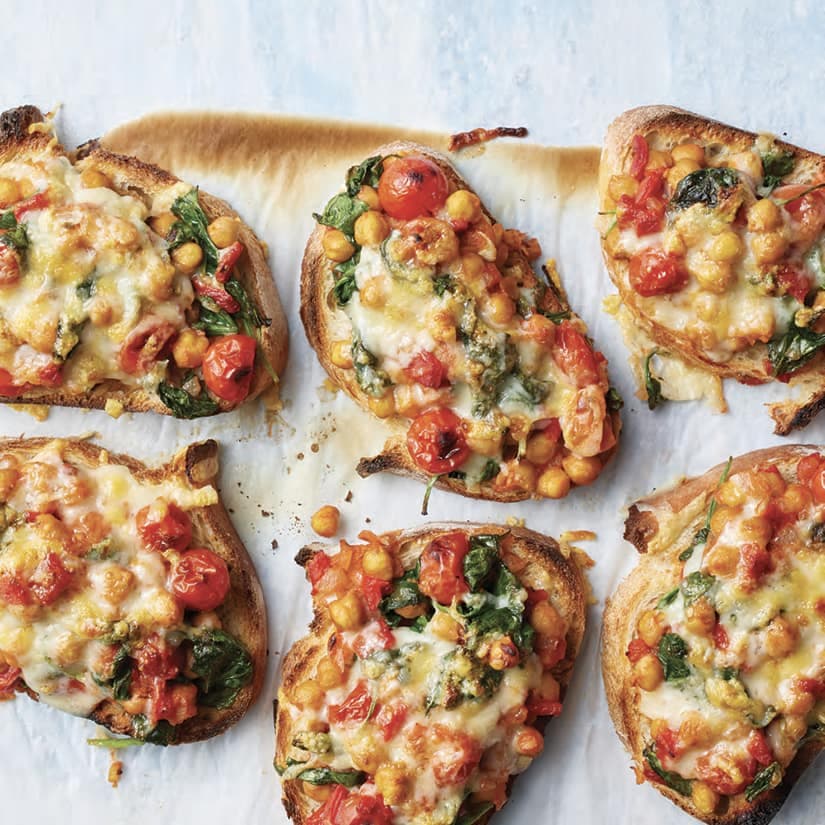 - Déposer les tranches de pain sur une plaque de cuisson ta- pissée de papier parchemin. Couvrir de la garniture aux pois chiches et parsemer du fromage.