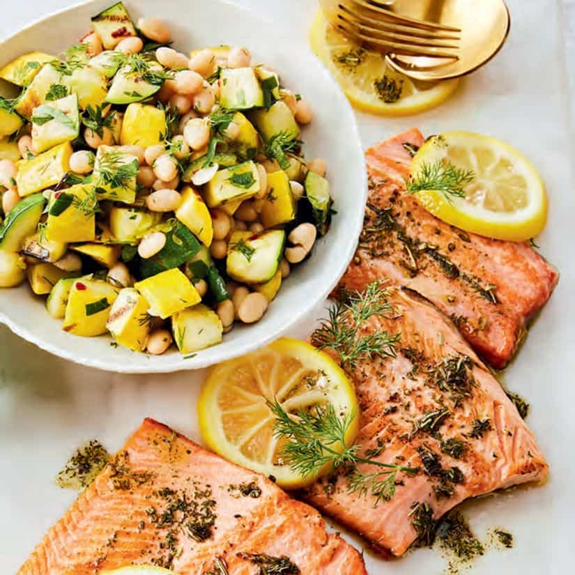 - Entre-temps, dans un grand bol, mélanger l'ail, l'huile d'olive, le reste du sel, puis le zeste et le jus de citron. Ajouter les courgettes grillées réservées, les haricots blancs, l'aneth et le persil. Mélanger délicatement pour bien enrober les ingrédients. Servir la salade avec la truite.