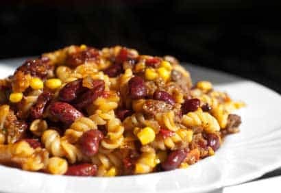 - Ajouter le chili et mélanger délicatement pour bien enrober les pâtes. Servir accompagné du bacon réservé, des oignons verts, du poivron et du fromage présentés séparément dans de petits bols.