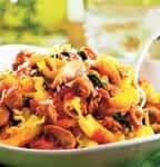 - Entre-temps, dans une casserole d'eau bouillante salée, cuire les pâtes de 7 à 10 minutes ou jusqu'à ce qu'elles soient al dente. Égoutter les pâtes et les remettre dans la casserole. Ajouter la sauce et mélanger délicatement pour bien enrober les pâtes.