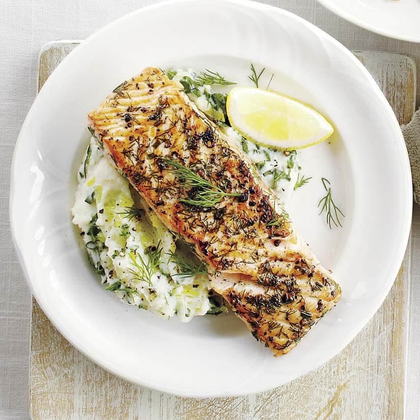 Pavés de saumon poêlés sur purée de pommes de terre et de chou-fleur