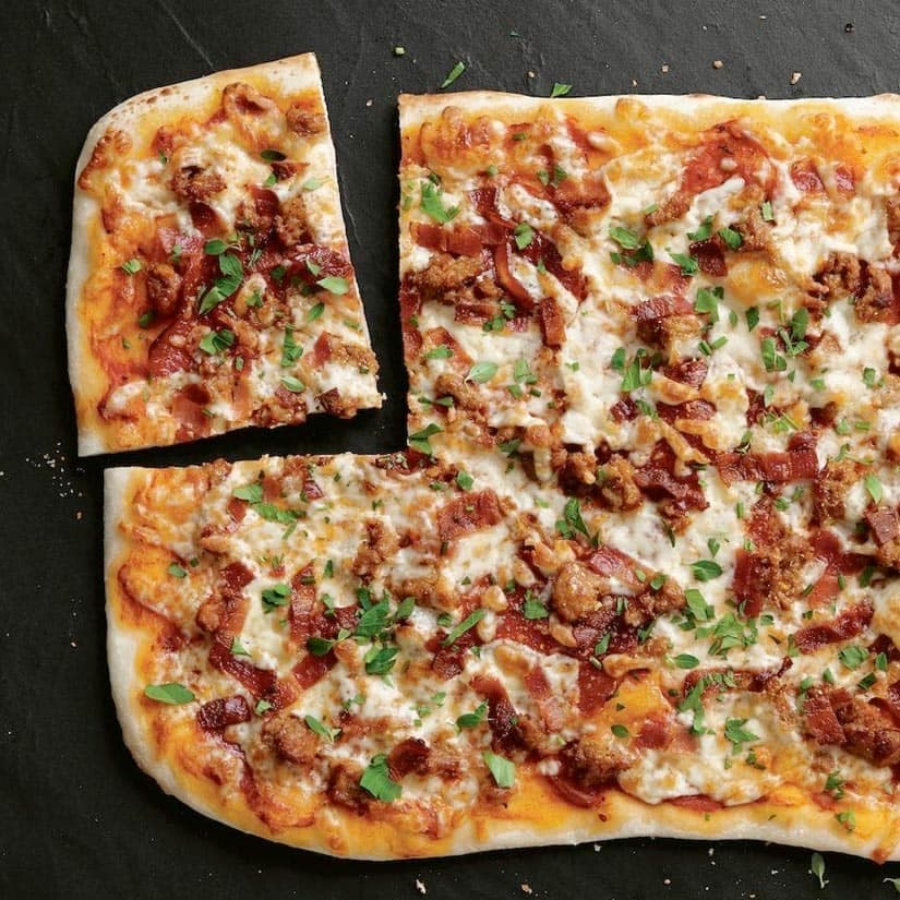 - Sur une surface légèrement farinée, abaisser la pâte à pizza, avec les mains ou un rouleau à pâte, en un rectangle d'environ 15 po x 10 po (38 cm x 25 cm).