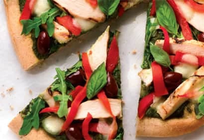 - Garnir du pesto, de la roquette, du poulet, du poivron, des olives et des mini-bocconcinis.