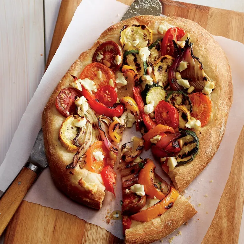 - Répartir les légumes grillés sur chaque croûte, puis couvrir des tomates. Parsemer du fromage de chèvre, des pignons et de la pancetta. Cuire au four préchauffé à 425°F (220°C) de 17 à 20 minutes ou jusqu'à ce que le dessous de la croûte soit doré.