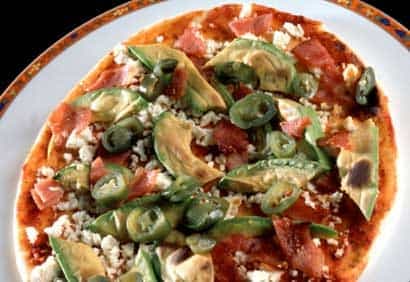 - Étendre la salsa aux tomates sur les pains pitas. Couvrir du poivron rouge haché, des tranches d'oignon, d'avocat, de fromage feta, d'olives noires et de fromage mozzarella.