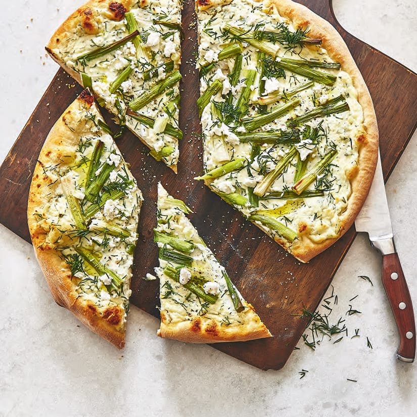 - Cuire au four préchauffé à 450 °F (230 °C) pendant 15 minutes ou jusqu'à ce que les croûtes soient dorées. Avant de servir, parsemer les pizzas du reste de l'aneth et arroser d'un filet d'huile d'olive ou de crème de balsamique, si désiré.