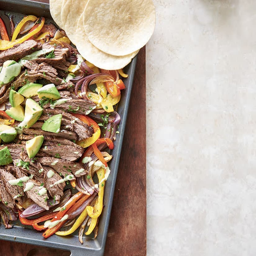 - Déposer la viande sur une plaque de cuisson, avec les légumes. Ajouter 2 c. à soupe (30 ml) d'huile et 1 c. à soupe (15 ml) de poudre de chili sur les légumes. Saler et poivrer. Bien mélanger. Cuire au four de 8 à 15 minutes, selon l'épaisseur de la viande et la cuisson désirée. Laisser reposer environ 2 minutes, puis trancher la viande en fines lanières. Garnir de dés d'avocat. Servir sur la plaque avec des petites tortillas de maïs et la sauce à la coriandre (voir la recette.)
