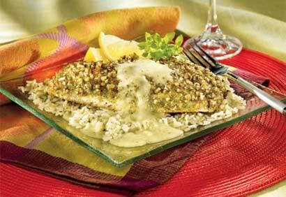 - 1. Badigeonner chaque côté des filets de poisson du pesto. Saler et poivrer. Rouler les filets dans les pacanes hachées et bien presser pour former une croûte. Déposer les filets de poisson sur une plaque de cuisson tapissée de papier-parchemin. Cuire sous le gril préchauffé du four à 500°F (260°C) de 2 à 3 minutes par côté ou jusqu'à ce que la chair du poisson soit opaque et se défasse facilement à la fourchette.