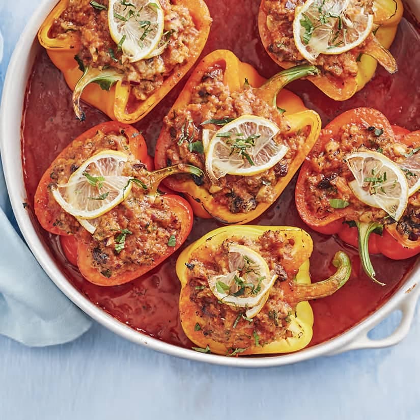 - 3. Dans une grande tasse à mesurer, mélanger l'huile d'olive, la sauce tomate et le bouillon de poulet. Verser sur les poivrons farcis. Garnir les poivrons farcis de rondelles de citron, si désiré. Cuire au centre du four 35 minutes ou jusqu'à ce que les poivrons soient ramollis, la viande, cuite, et la farce, bien chaude. Servir garni de menthe fraîche, si désiré.