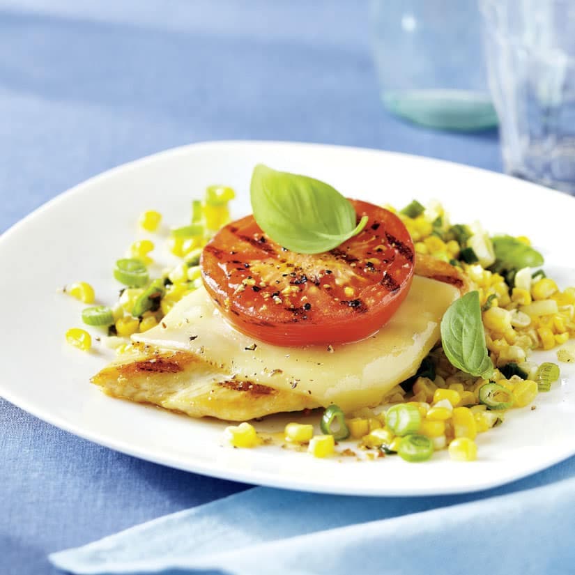 - Régler le barbecue au gaz à puissance moyenne-élevée. Retirer le poulet de la marinade (jeter la marinade), le mettre sur la grille huilée du barbecue et ajouter les tomates. Fermer le couvercle et cuire pendant 4 minutes. Retourner le poulet et les tomates et couvrir le poulet des tranches de fromage. Poursuivre la cuisson pendant environ 2 minutes ou jusqu'à ce que le poulet ait perdu sa teinte rosée à l'intérieur et que les tomates aient ramolli et légèrement noirci.