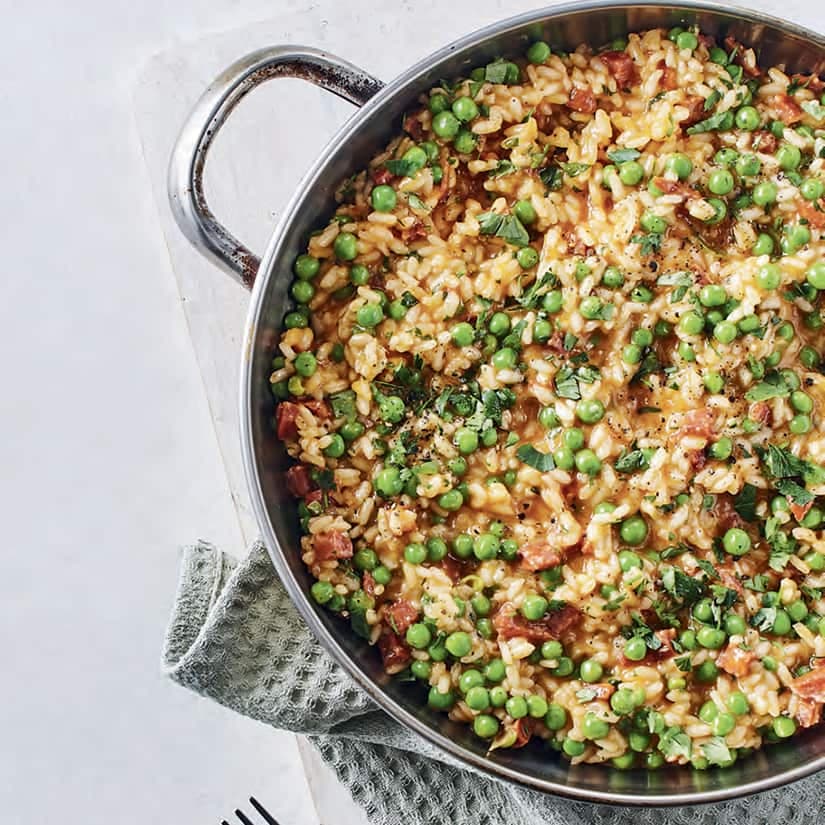 - Dans la casserole, ajouter les petits pois et le persil, et réchauffer à feu doux 2 minutes en brassant. Retirer la casserole du feu et incorporer le parmesan. Saler et poivrer. Servir aussitôt, avec plus de parmesan râpé si désiré.