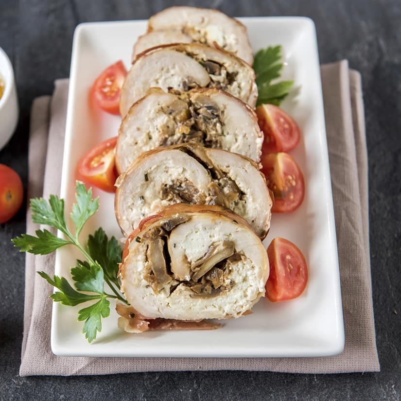 Pour cette recette, il vaut mieux demander à notre boucher de désosser une poitrine de dindon pour nous, car les poitrines désossées ne viennent habituellement pas avec la peau (choisir une poitrine non désossée d'environ 5 lb/2,5 kg). Pour la farce, un mélange de pleurotes, de champignons café et de shiitake (enlever les pieds des shiitake) sera parfait.