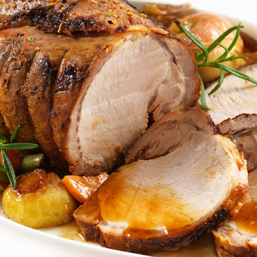 - Au moment de servir, couper le rôti de porc en tranches et accompagner des pommes de terre.
