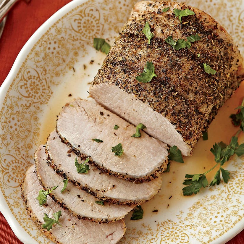 - Cuire au four préchauffé à 325°F (160°C) de 40 à 50 minutes ou jusqu'à ce qu'un thermomètre à viande inséré au centre du rôti indique 150°F (65°C). Déposer le rôti sur une planche à découper et le couvrir de papier d'aluminium, sans serrer. Laisser reposer pendant 15 minutes (la température interne du rôti devrait passer à 160°F/ 71°C en reposant).