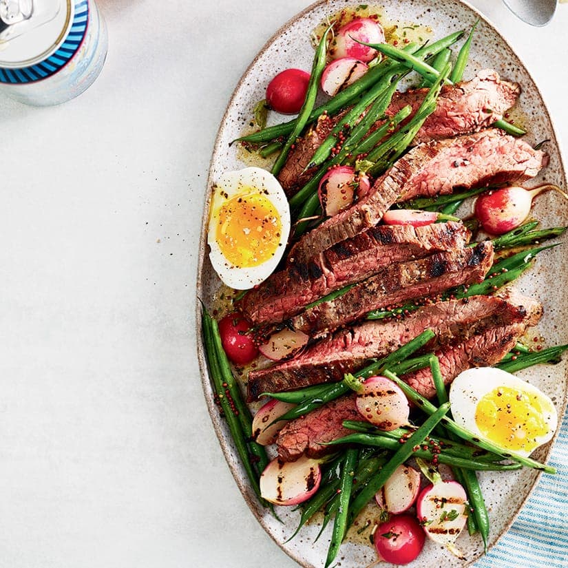 - Couper le bifteck en lanières dans le sens contraire des fibres de la viande. Répartir le bifteck et les légumes dans des assiettes. Garnir des œufs.