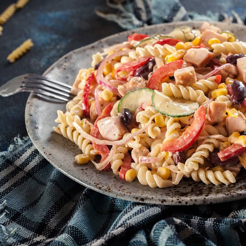 - Ajouter le salami, les olives, les tomates et le poivron rouge grillé et mélanger pour bien enrober tous les ingrédients. (Vous pouvez préparer la salade de pâtes à l'avance et la couvrir. Elle se conservera jusqu'au lendemain au réfrigérateur.)