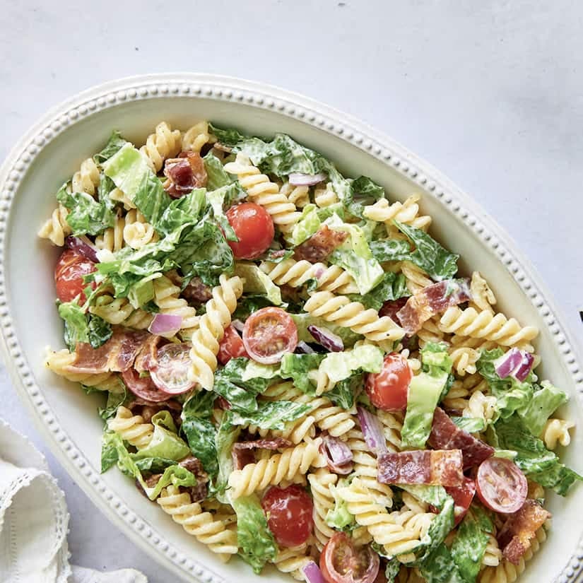 - Ajouter le bacon, les tomates, la laitue, l'oignon rouge, les herbes fraîches et le parmesan. Saler et poivrer au goût, puis mélanger. Ajouter la vinaigrette ranch crémeuse. Remuer et servir.