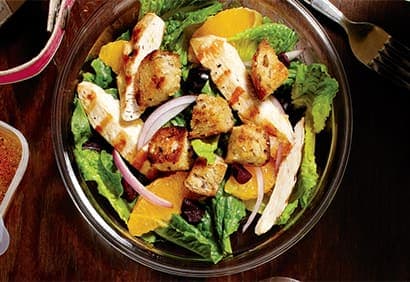 1. Dans deux contenants hermétiques d'une capacité de 4 t (1 L) chacun, répartir la laitue, l'oignon, les olives, les suprêmes d'orange réservés et le poulet. (Vous pouvez préparer la salade jusqu'à cette étape. Elle se conservera jusqu'au lendemain au réfrigérateur.)