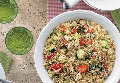 - Dans un grand bol, mélanger la préparation de riz, la tomate, le concombre, le poivron rôti, les olives, le persil et le fromage feta. Arroser de la vinaigrette et mélanger pour bien enrober les ingrédients. (Vous pouvez préparer la salade à l'avance et la mettre dans quatre contenants hermétiques. Elle se conservera jusqu'au lendemain au réfrigérateur.)