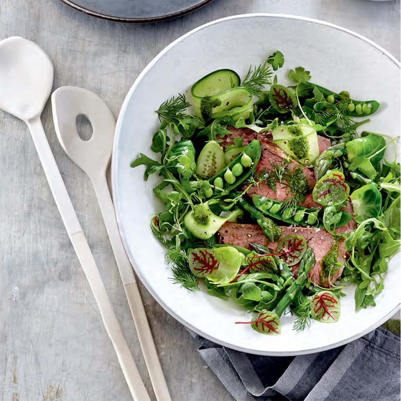 - Déposer la roquette dans une grande assiette de service ou sur une planche. Disposer dessus les tranches de bifteck, les légumes réservés, les concombres et les herbes. Arroser de la vinaigrette et parsemer de fleur de sel. Poivrer.