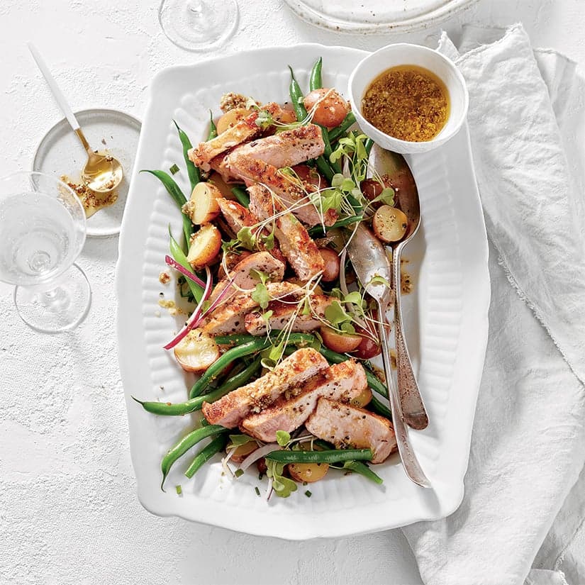 - Dans un grand bol, mélanger les haricots verts et les pommes de terre réservés avec la vinaigrette. Répartir la salade dans 4 assiettes et garnir des tranches de porc.