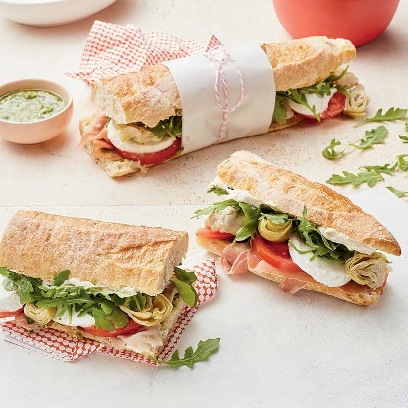 - Badigeonner la moitié inférieure de la baguette du pesto de basilic.