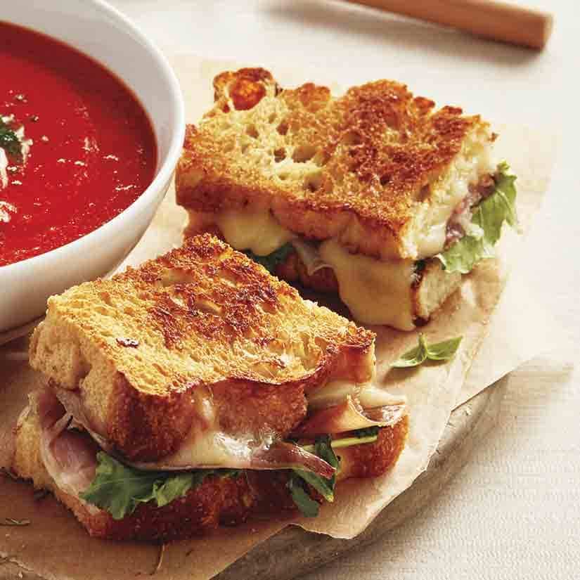 - Sur 4 des tranches de focaccia, répartir le fromage mozzarella, le prosciutto et la roquette. Couvrir des 4 tranches de focaccia restantes. Badigeonner chaque côté des sandwichs de l'huile.