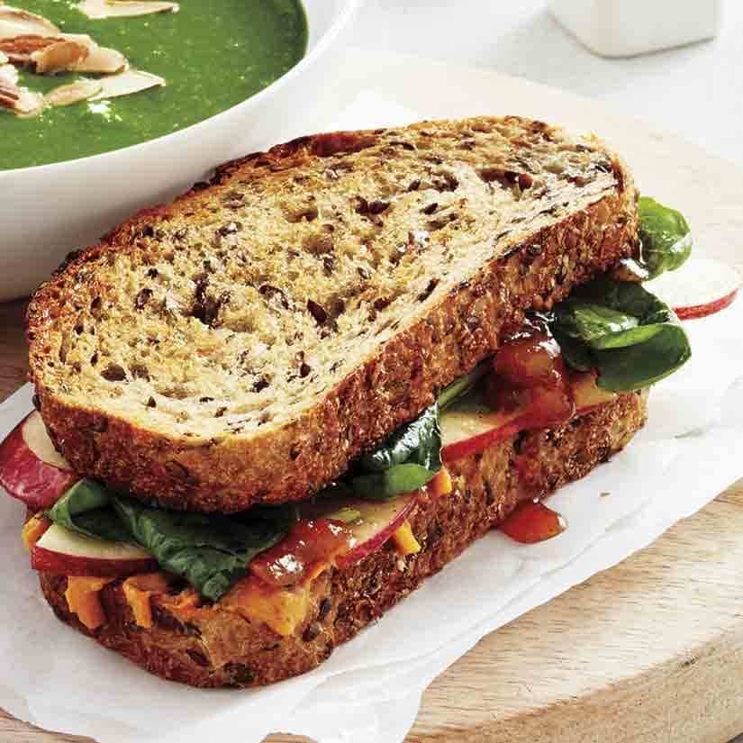 - Sur 4 des tranches de pain, étendre le chutney, puis couvrir des épinards, de la pomme et du fromage végétal. Couvrir des 4 tranches de pain restantes. Badigeonner chaque côté des sandwichs de l'huile.