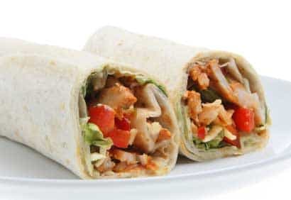 5. Étendre la mayonnaise à l’ail réservée sur les tortillas. Couvrir les tortillas du poulet, du bacon réservé, de la laitue et des tranches de tomate. Plier les côtés et le bas des tortillas vers le centre et rouler en serrant.