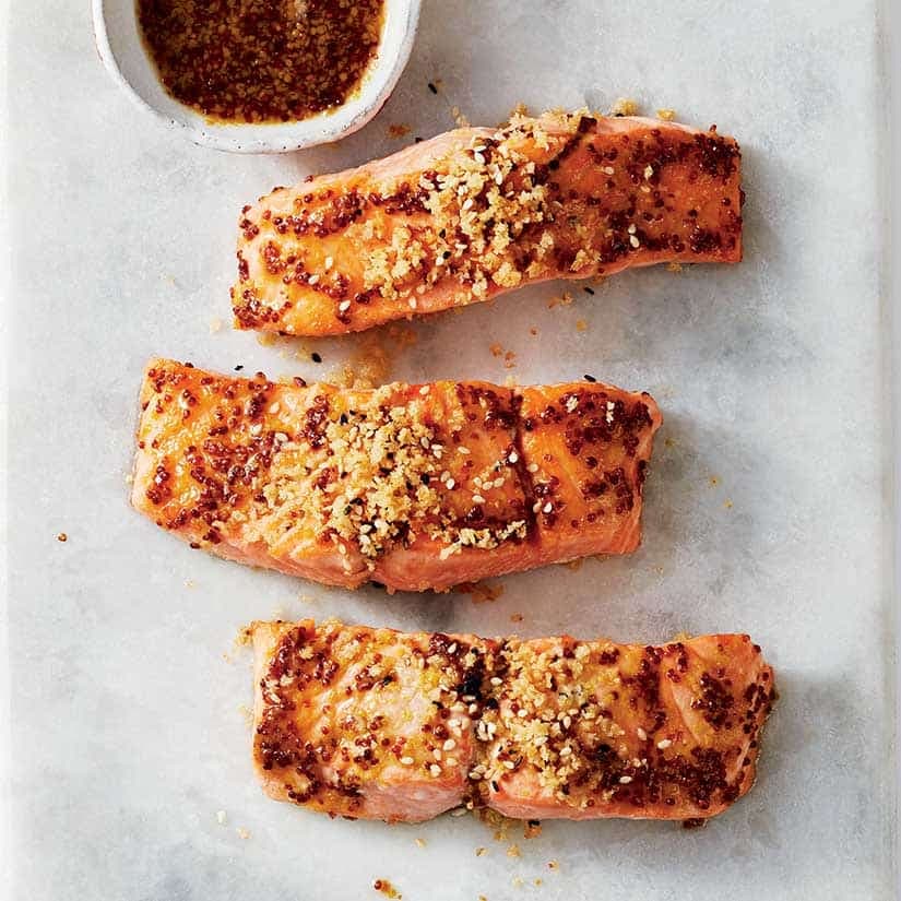 - Dans un bol, mélanger la moutarde, le sirop d'érable et 1 c. à thé (5 ml) des graines de sésame. Mettre les filets de saumon sur une plaque de cuisson tapissée de papier parchemin et badigeonner chacun de 1 c. à tab (15 ml) de la préparation à la moutarde. Cuire au four préchauffé à 425 °F (220 °C) pendant 8 minutes ou jusqu'à ce que le saumon se défasse à la fourchette.