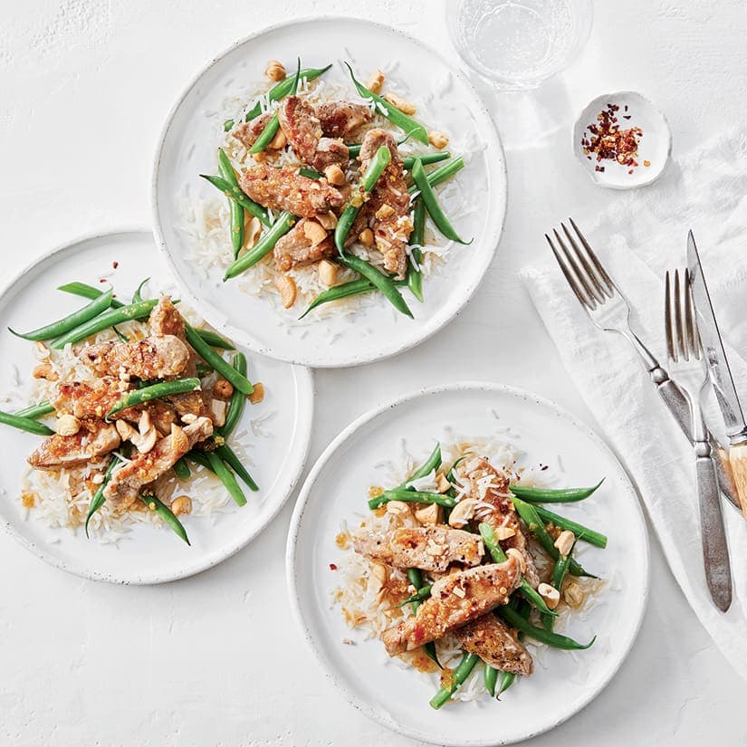 - Dans le poêlon, ajouter le miel, le vinaigre et les flocons de piment. Porter à ébullition. Cuire 2 minutes, en brassant souvent. Ajouter le porc et les haricots réservés avec le jus de cuisson accumulé dans le bol. Réchauffer en remuant délicatement. Répartir le riz réservé dans des assiettes. Couvrir du sauté de porc et parsemer des noix de cajou.